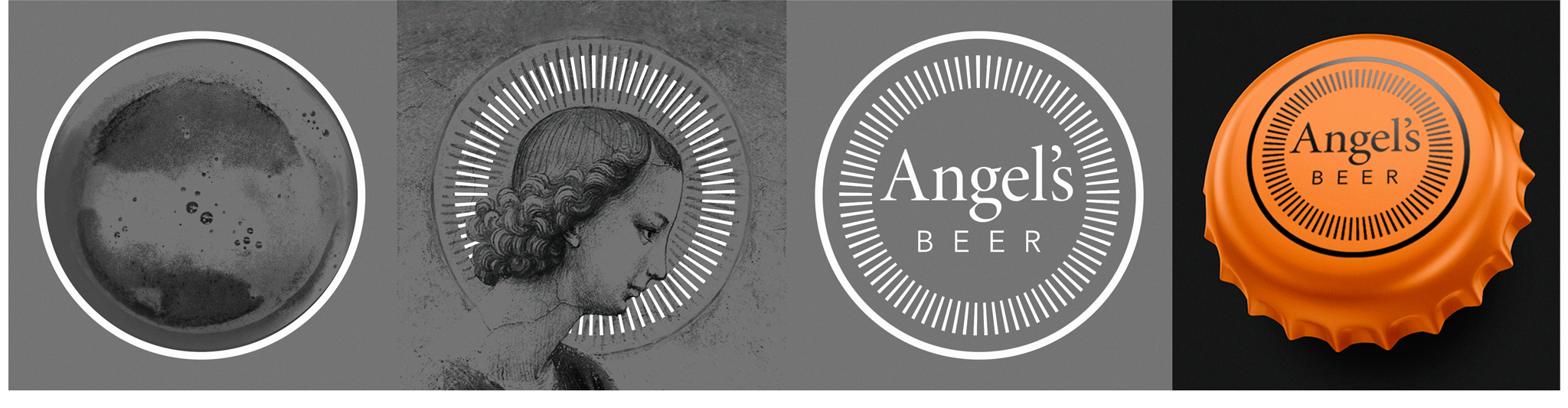 Per il logo, abbiamo unito graficamente la circonferenza di un bicchiere di birra con l'aureola di un angelo (dal naming). Il risultato è un logo elegante ed equilibrato, capace di trasmettere il carattere ricercato del brand.